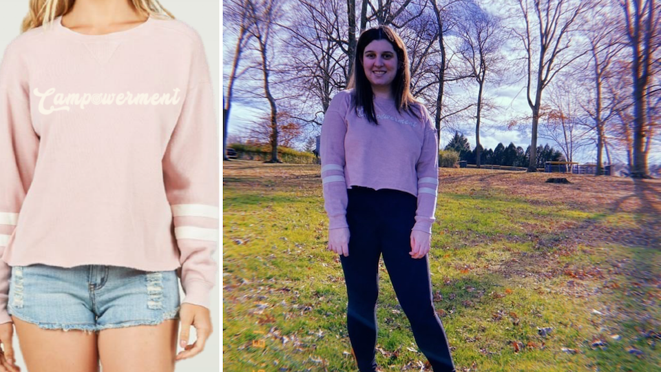 $60 // Fits all body types well; super comfy; runs wide & 1 size large (long arms); cropped above waist.Message: Campowerment has my heart
